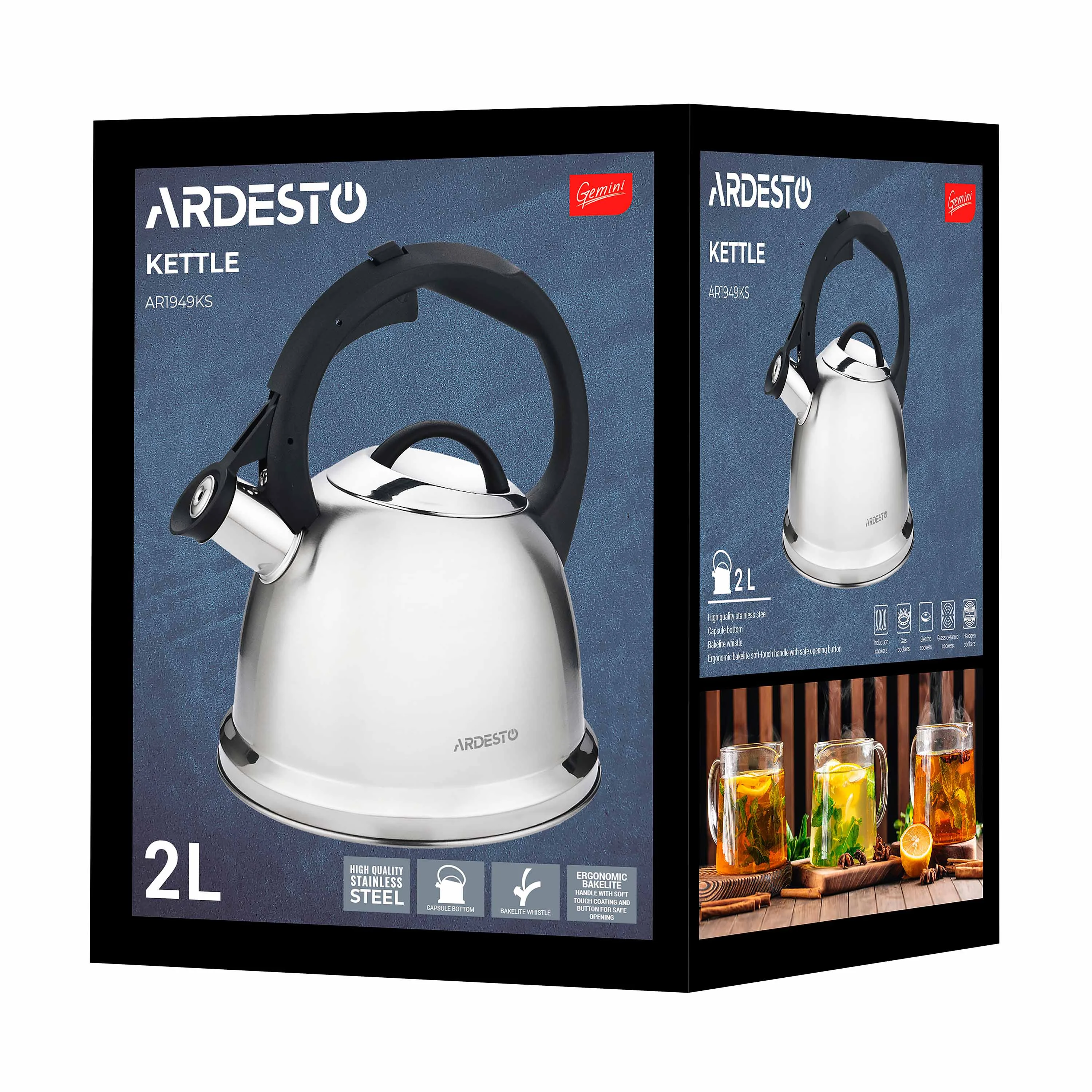 Сріблястий блиск нержавіючої сталі, з якої виготовлено чайник ARDESTO Gemini, додасть стильних акцентів дизайну кухні. Модель об’ємом 2 літри має однакову товщину корпусу та днища – 0,5 мм. Виконане в чорному кольорі, руків’я вкрито нейлоном, що забезпечує надійний хват, тож можна брати чайник мокрими руками без остраху, що він вислизне. Також руків’я має вбудований важіль для відкриття чи закриття маленької кришечки на носику. Така конструкція мінімізує ризик обпекти руки гарячою парою.