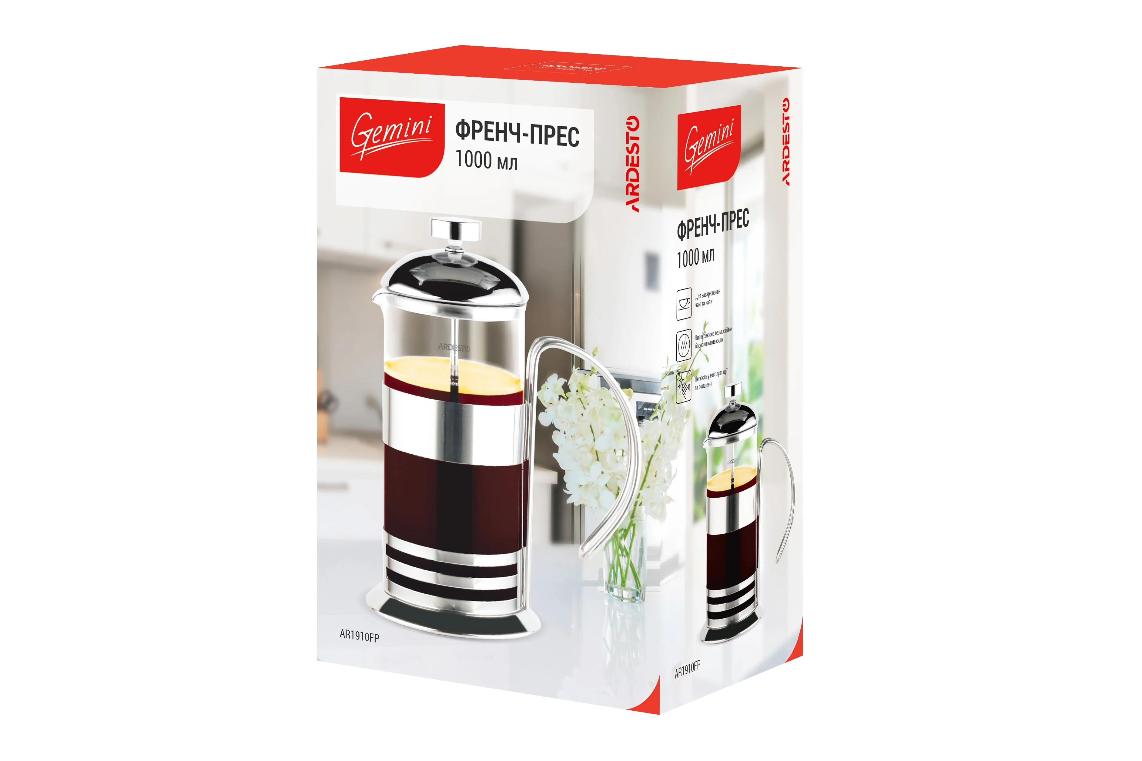 Френч-прес Ardesto Gemini Asti, 1000мл, боросилікатне скло, нержавіюча сталь, прозорий