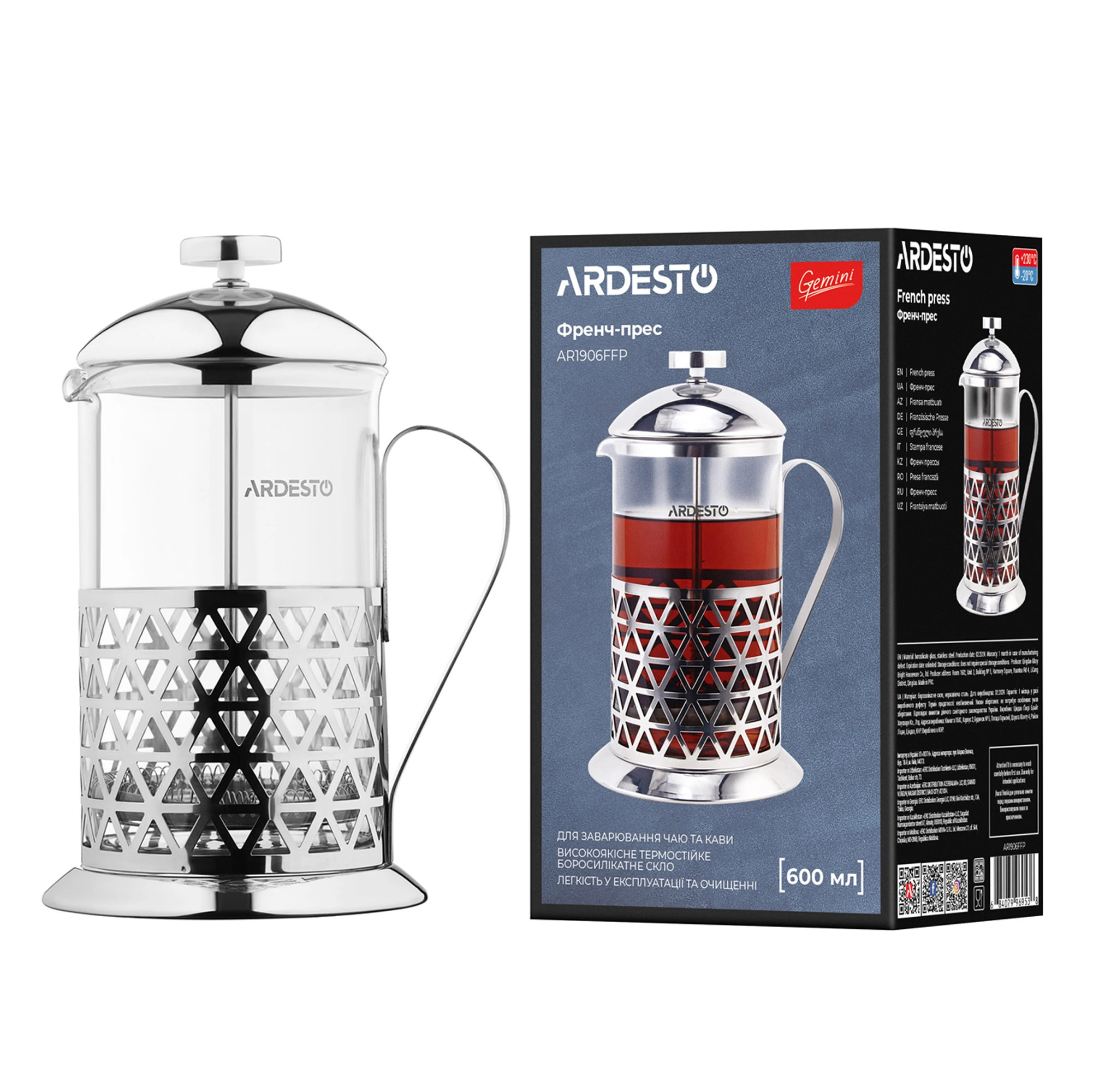Френч-прес Ardesto Gemini Fasano, 600мл, боросилікатне скло, нержавіюча сталь, прозорий