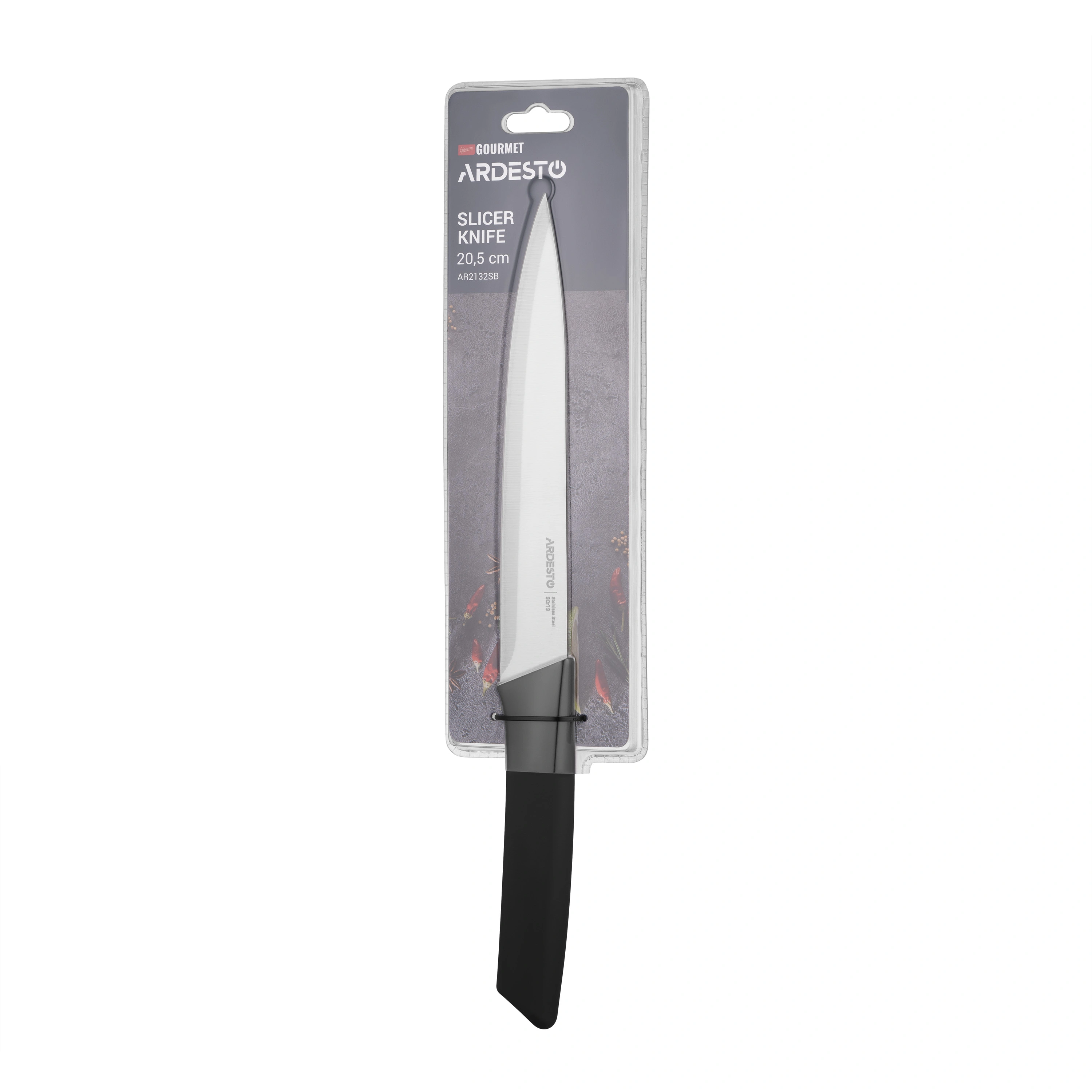 Слайсерний ніж ARDESTO Gemini Gourmet – це поєднання елегантного дизайну та практичності. Завдяки лезу з нержавіючої сталі 3CR13 завдовжки 20,5 см він згодиться для нарізання тонких скибочок – від м’яса до сиру. Чорне пластикове руків’я забезпечує надійний хват, а також додає стильного вигляду.