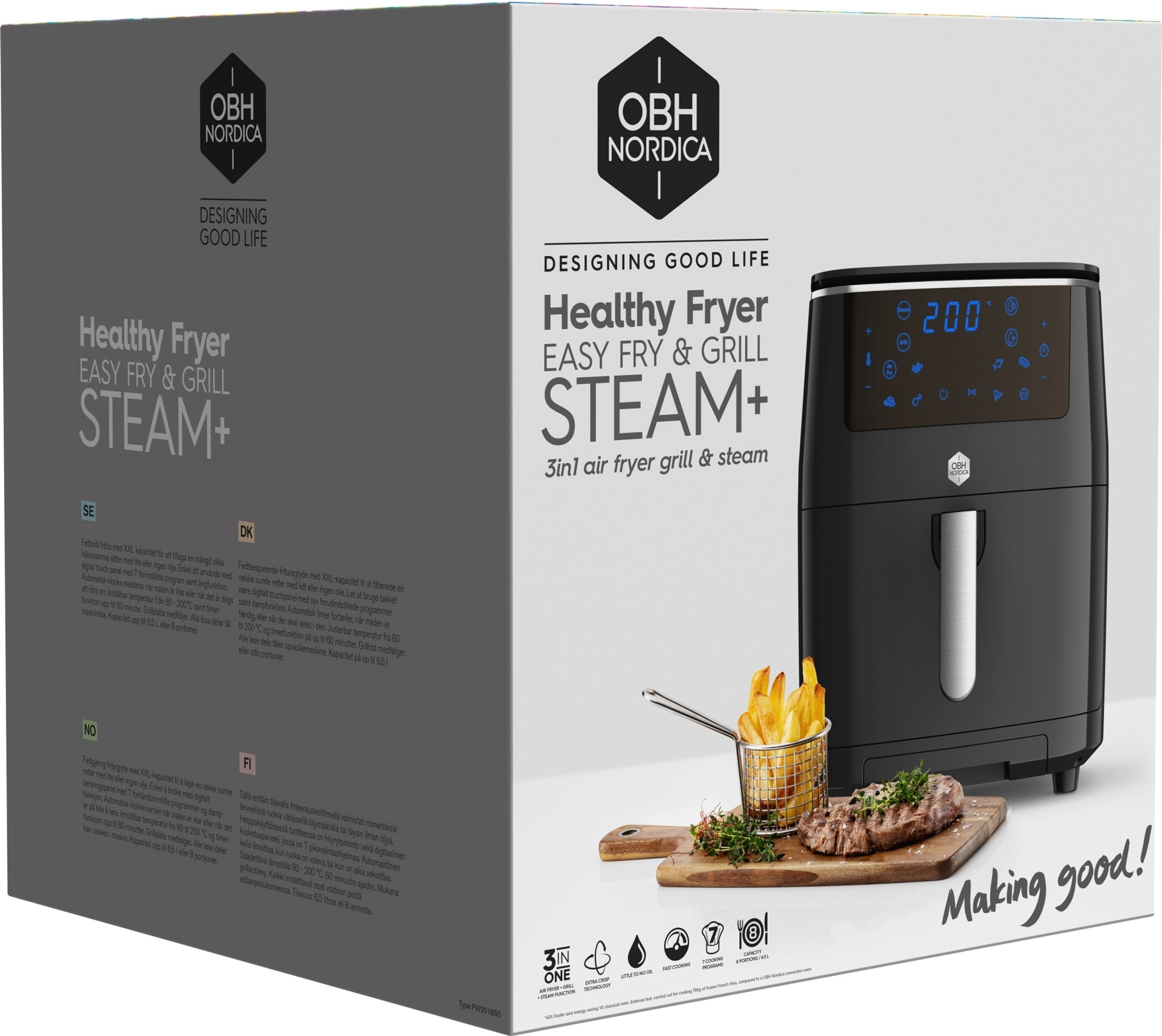 OBH Nordica Easy Fry & Steam Black – це універсальна мультипіч 3-в-1, що поєднує функції аерофритюрниці, пароварки та духовки. Завдяки потужності 1700 Вт і великій чаші на 6,5 л можна легко готувати страви для всієї родини. Сенсорне керування, широкий діапазон температур від 80°C до 200°C та 8 автоматичних програм забезпечують зручність та ідеальні результати приготування.