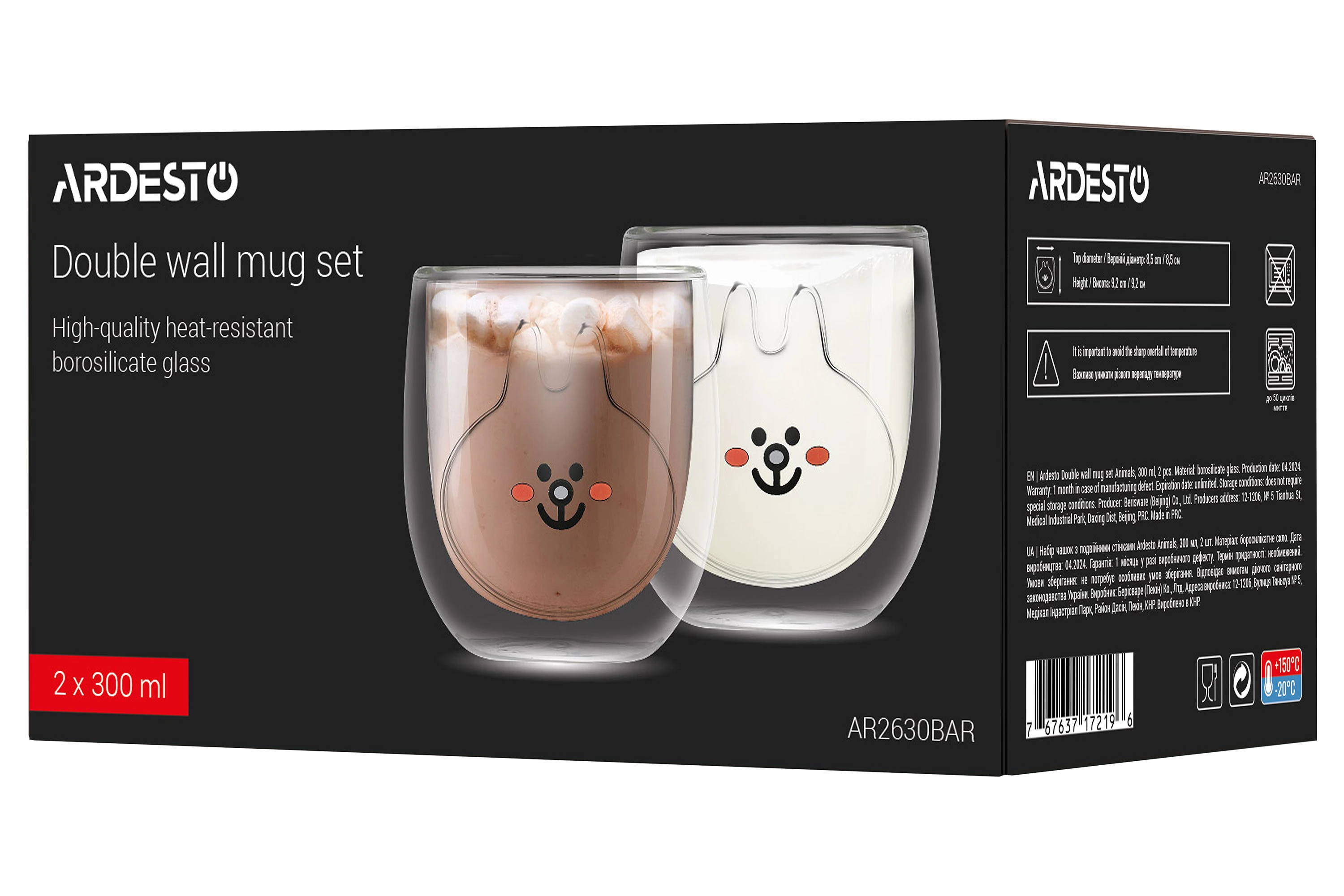 Набір чашок з подвійними стінками Ardesto Animals, 300мл, 2шт, боросилікатне скло, прозорий