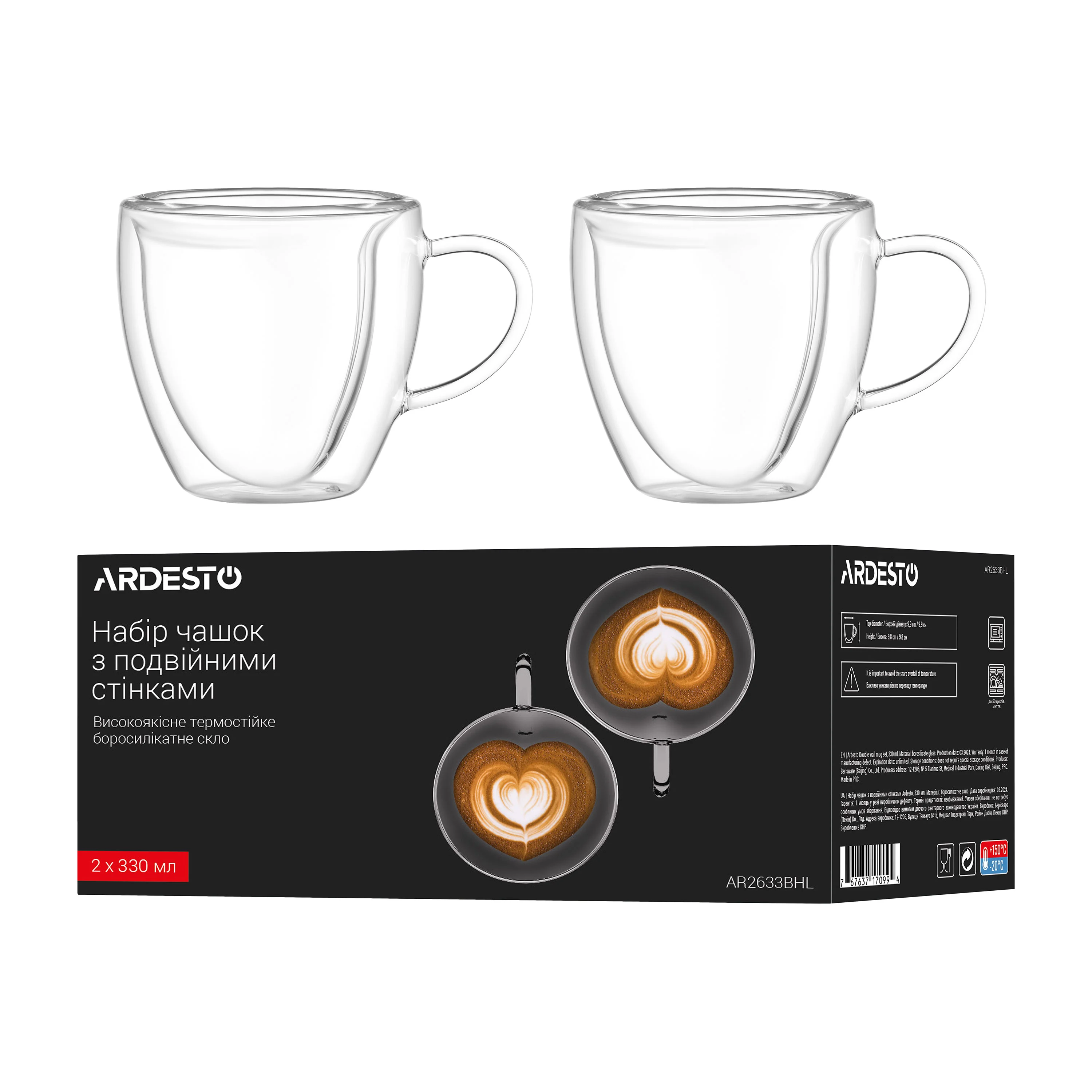 Набір чашок з ручками і подвійними стінками Ardesto, 330мл, 2шт, боросилікатне скло, прозорий