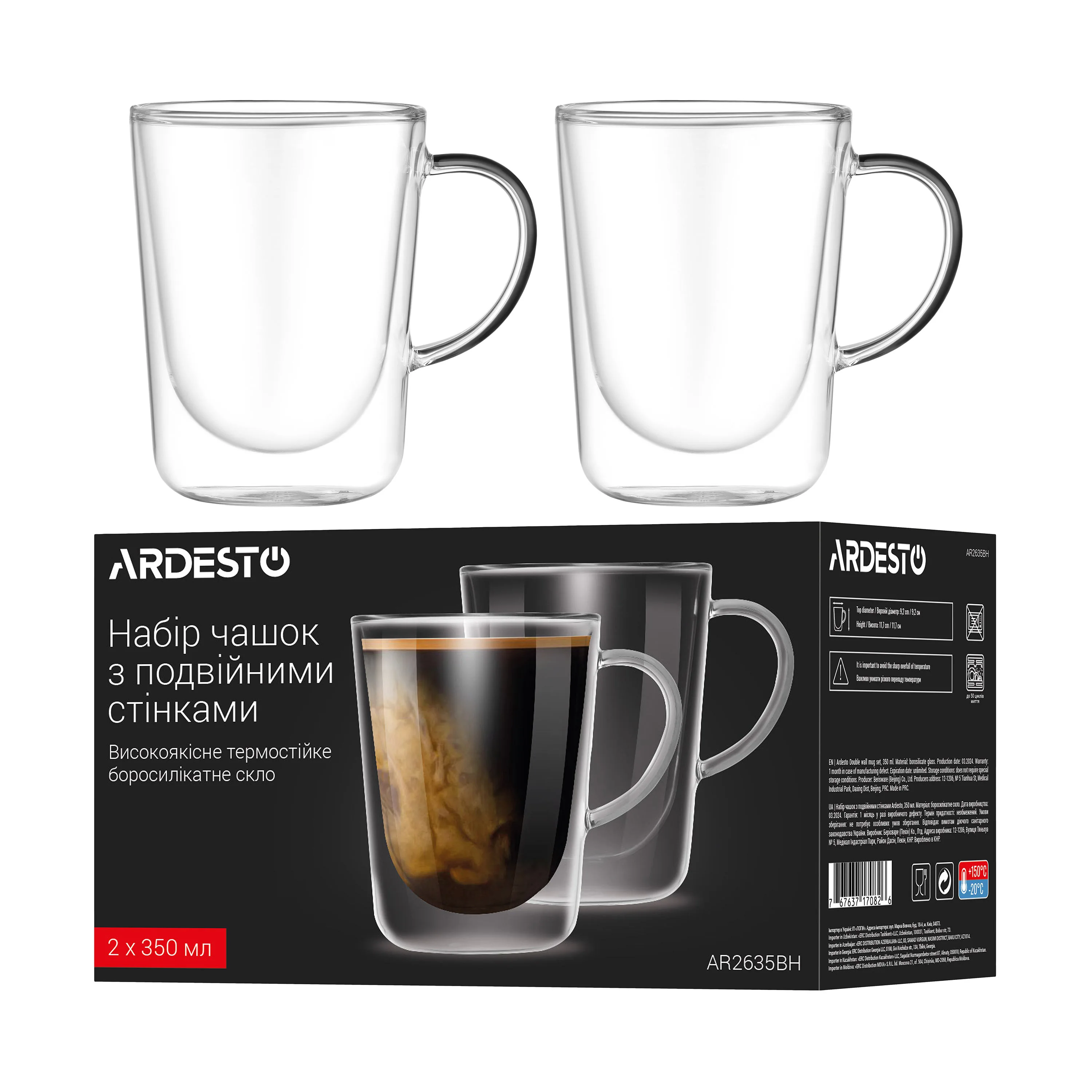 Набір чашок з ручками і подвійними стінками Ardesto, 350мл, 2шт, боросилікатне скло, прозорий