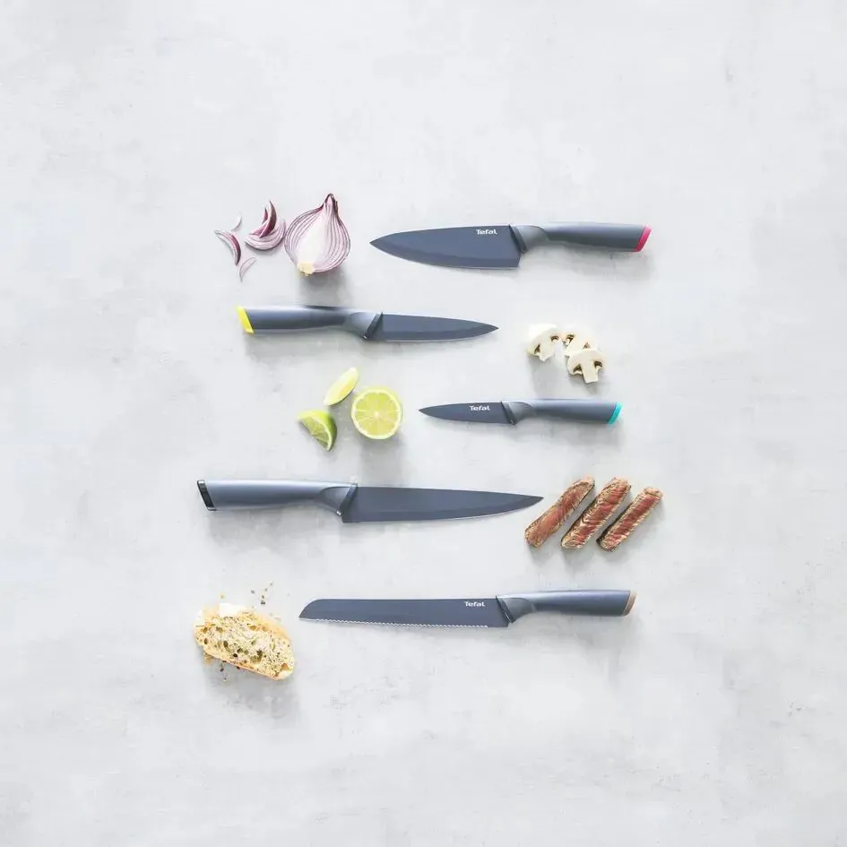 Ножі Tefal Fresh Kitchen K122S504 - це повний набір ножів з лезами з нержавіючої сталі з антипригарним покриттям, що забезпечують високу стійкість і максимальну зручність у використанні завдяки ергономічній ручці з м'яким покриттям