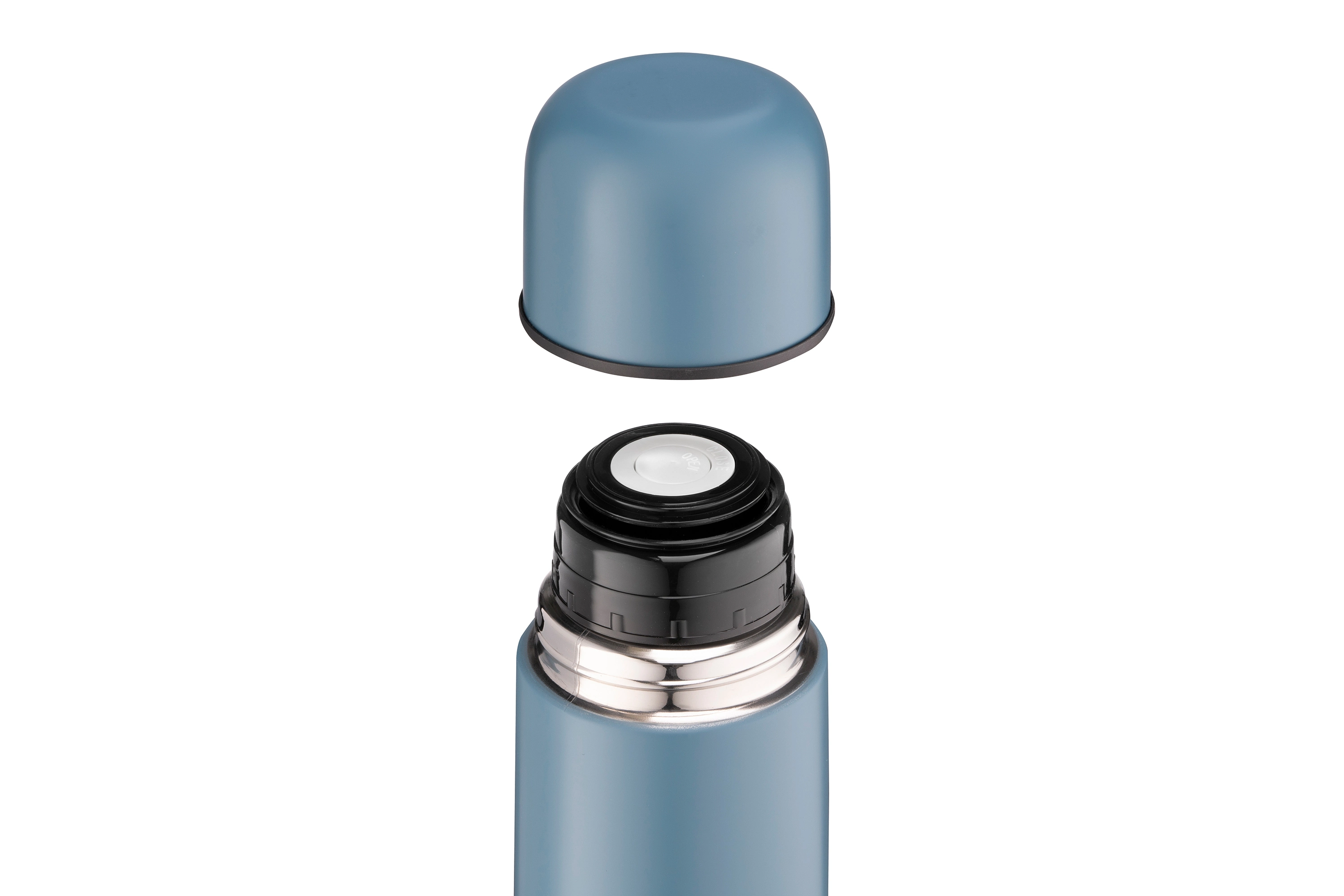 Термос із нержавіючої сталі (18/10) темно-синього кольору заввишки 31,5 см об’ємом 1000 мл. Здатний зберігати температуру гарячого напою протягом 12 годин, а холодного – протягом 24 годин. Не можна мити в посудомийній машині.