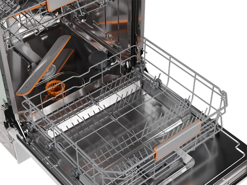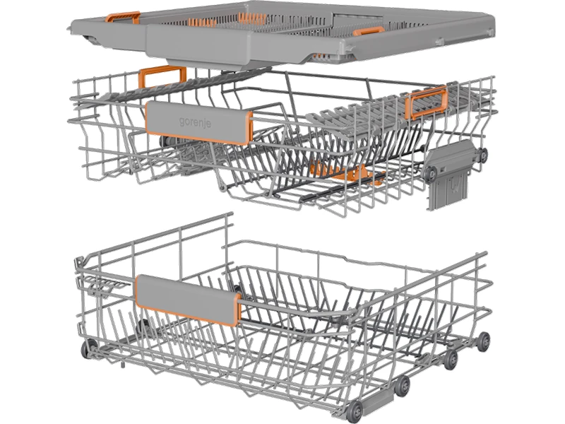 Кошики оснащені виділеними рухомими елементами та налаштованим розташуванням кошика для зручного завантаження. Дійсно проста дворівнева система регулювання кошика дозволяє розповісти навіть найбільші каструлі та тарілки. Решітка для тарілок у нижньому кошику легко складається. Столові прилади можна ідеально розписати на спеціальному підносі, де вони розташовуються окремо для ідеального результату очищення та сушіння. Кожна деталь розроблена для максимально зручного використання.