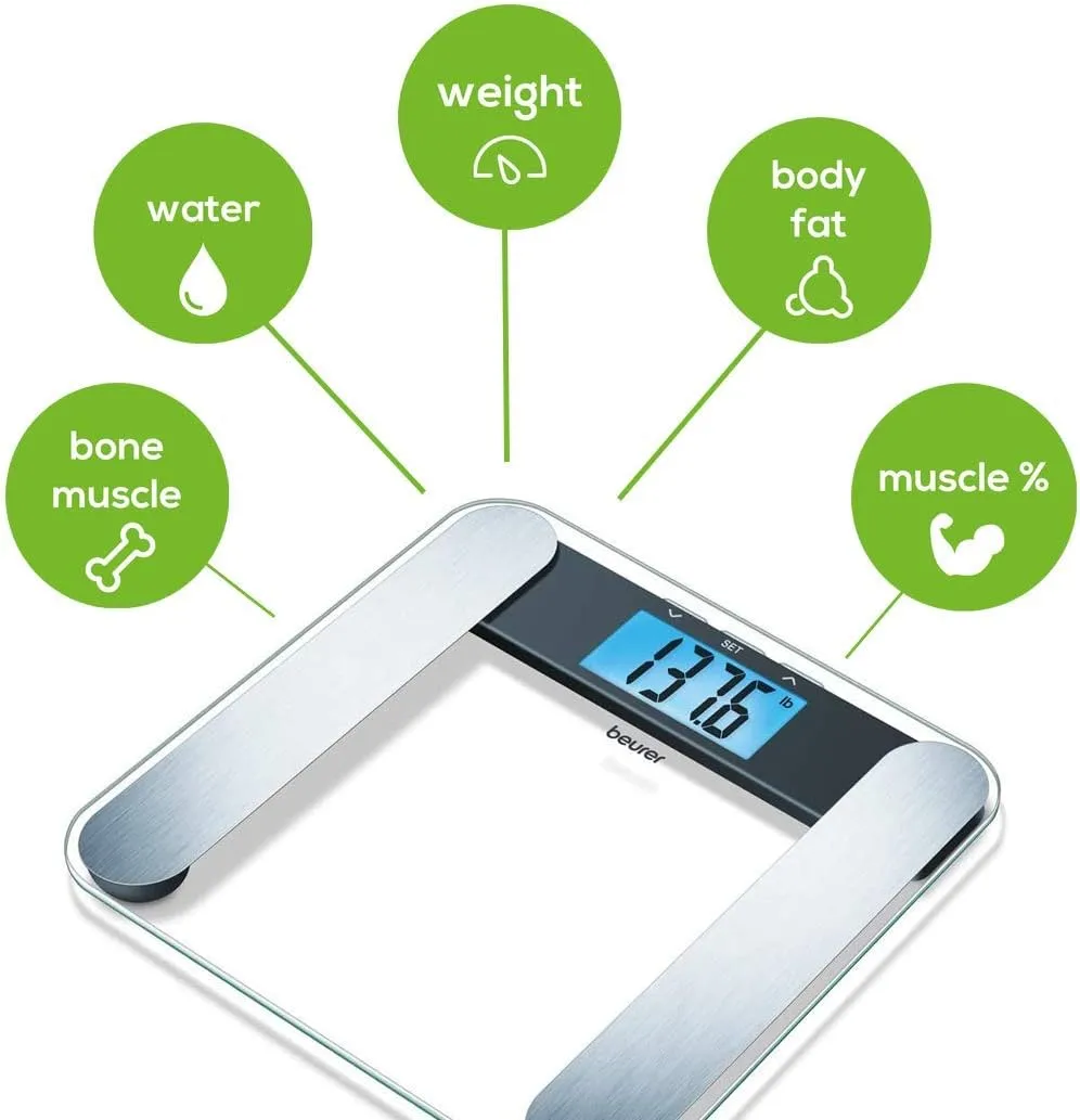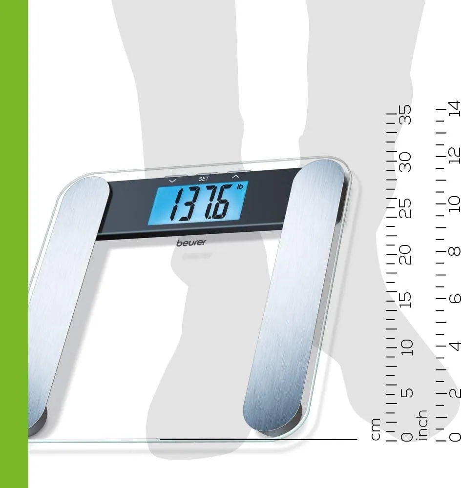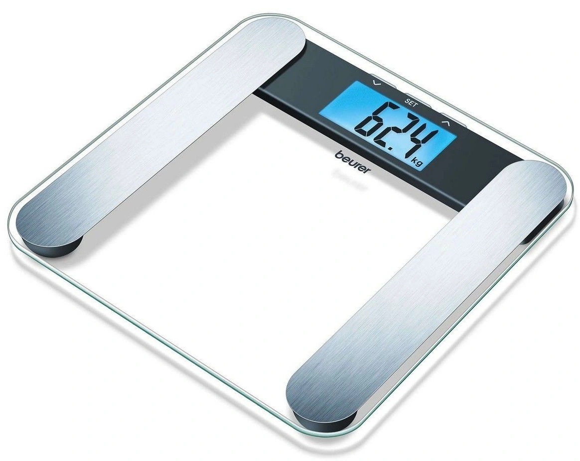 Велика опорна поверхня зі скла товщиною 8 мм. Дуже великий дисплей з синім підсвічуванням. Вага, жирова і кісткова маса, частка вологи і м'язової тканини. Електроди з полірованої нержавіючої сталі. П'ять рівнів активності. Технологія включення Quick Start. Автоматичне вимикання, індикація перевантаження. Максимальна вага 180 кг. Розмір цифр 40 мм.